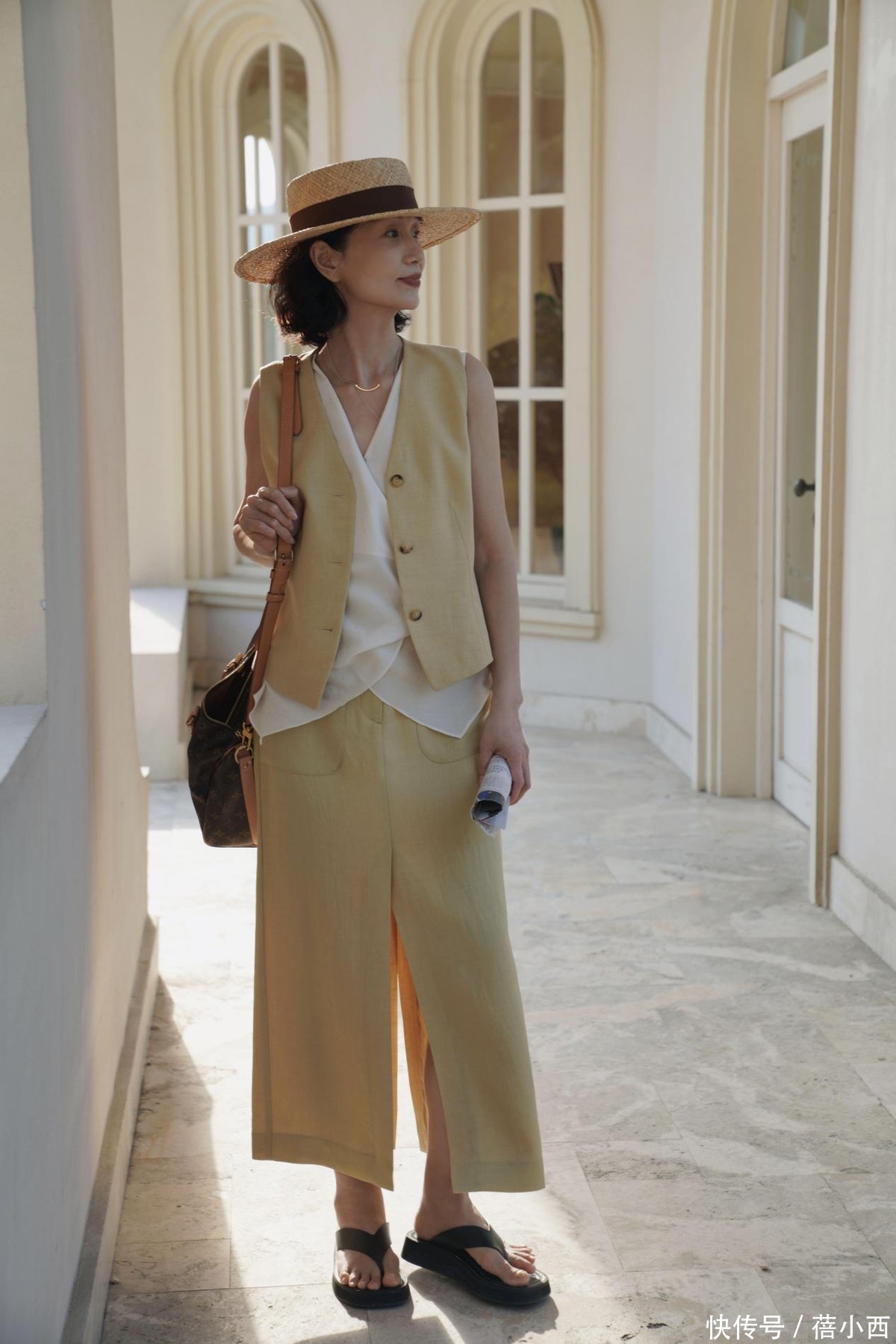 中年女人选配饰,不用太花哨,选对了特别提气质。就说三木妈妈的包包吧,不追求那些花里胡哨的爆款,选个皮质好点的就行,平时出门背个深棕、焦糖色的托特包,能装又沉稳,尺寸别太大,不然显拖沓,适中的大小就好。