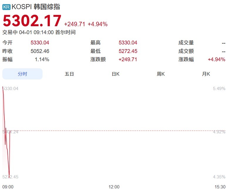 【大河财立方消息】4月1日,日韩股市大幅高开,韩国综合指数涨5.45%,SK海力士涨超8%,三星电子涨超7%。日经225指数涨1.75%。