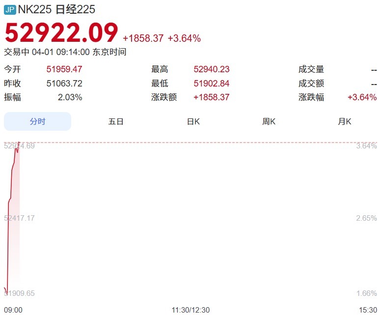 截至发稿,日经225指数大涨超1800点至3.64%,韩国综合指数涨4.94%。