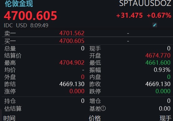 现货黄金重回4700美元整数关口,截至发稿日内涨0.67%。